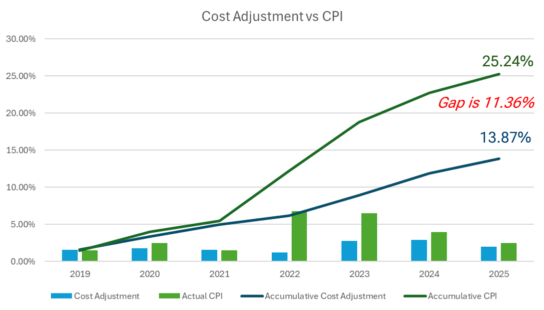 Our data shows that the cost adjustments for providers have not been keeping up with the levels of inflation over the past few years. This gap means centres are forced to cut costs and/or find income through other streams, like increasing parent fees. The chart shows how significant the gap has grown.
