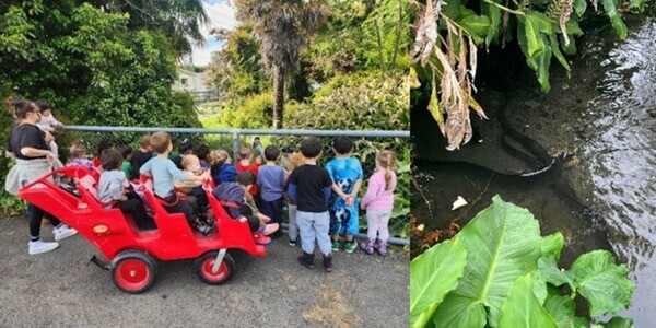 Post excursion, our tamariki felt sad about the rubbish hurting tuna and all living creatures and expressed that they wanted to clean more local awa and creeks. With much interest and curiosity, kaiako took the tamariki to look through the grate of our storm drain at the Centre. Tamariki realised there were lots of toys and rubbish in our own drain a very enthusiastic whakapai (tidy up) began!