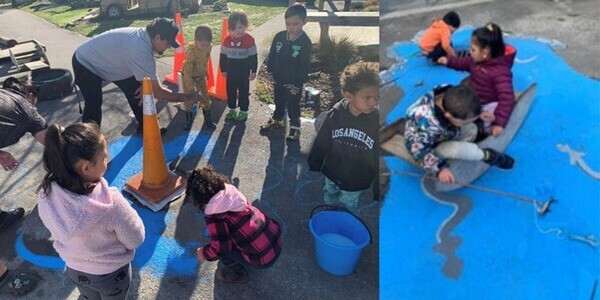 This learning and interest has been extended with all sorts of activities and mahi over the months that have followed and supports our commitment to Wairarapatanga and protecting our whēnua. One such activity was a source of great discussion and input from our tamariki – the painting of very own awa! Informed by designs created by the children, two of our centre whānau got to work and painted (helped and overseen by very enthusiastic site managers) an awa complete with tuna flowing to our storm drain.
