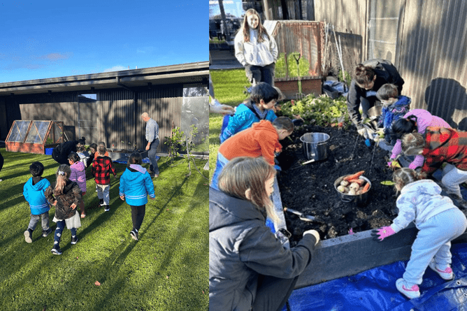 Our close connection with the Young Parents College (TPU) provided further opportunity for collaborative learning. Together we reflected on ways to give tamariki hands-on experiences grounded in te ao Māori. Kaiako James designed a planting simulation, where instead of planting new crops, tamariki dug up kūmara and potatoes hidden in the soil – learning that kai must first be grown and harvested before it can be prepared and shared. This experience was followed by a pretend pig hunt to prepare for a bacon bone boil-up, helping tamariki understand the whakapapa of food and its role in whānau gatherings.